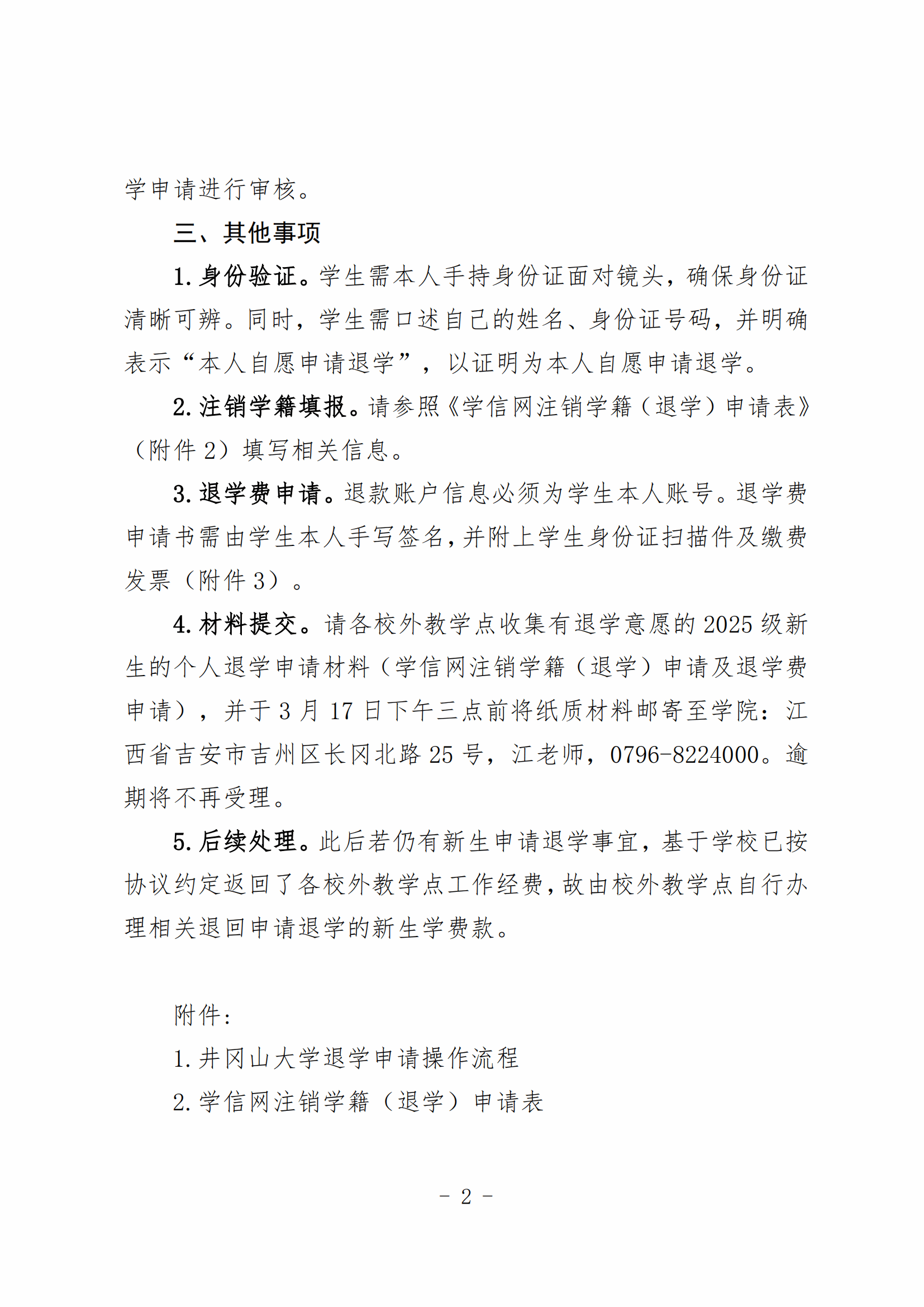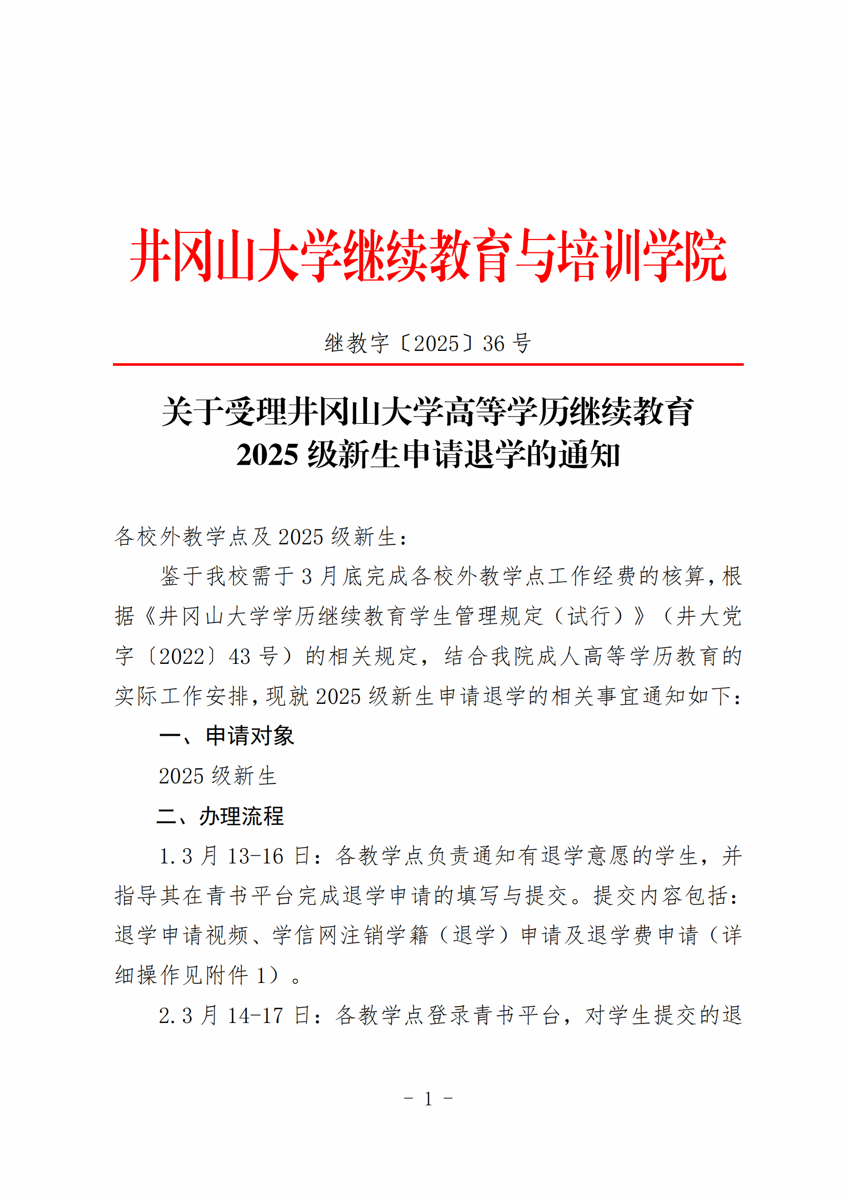 关于受理井冈山大学高等学历继续教育2025级新生申请退学的通知