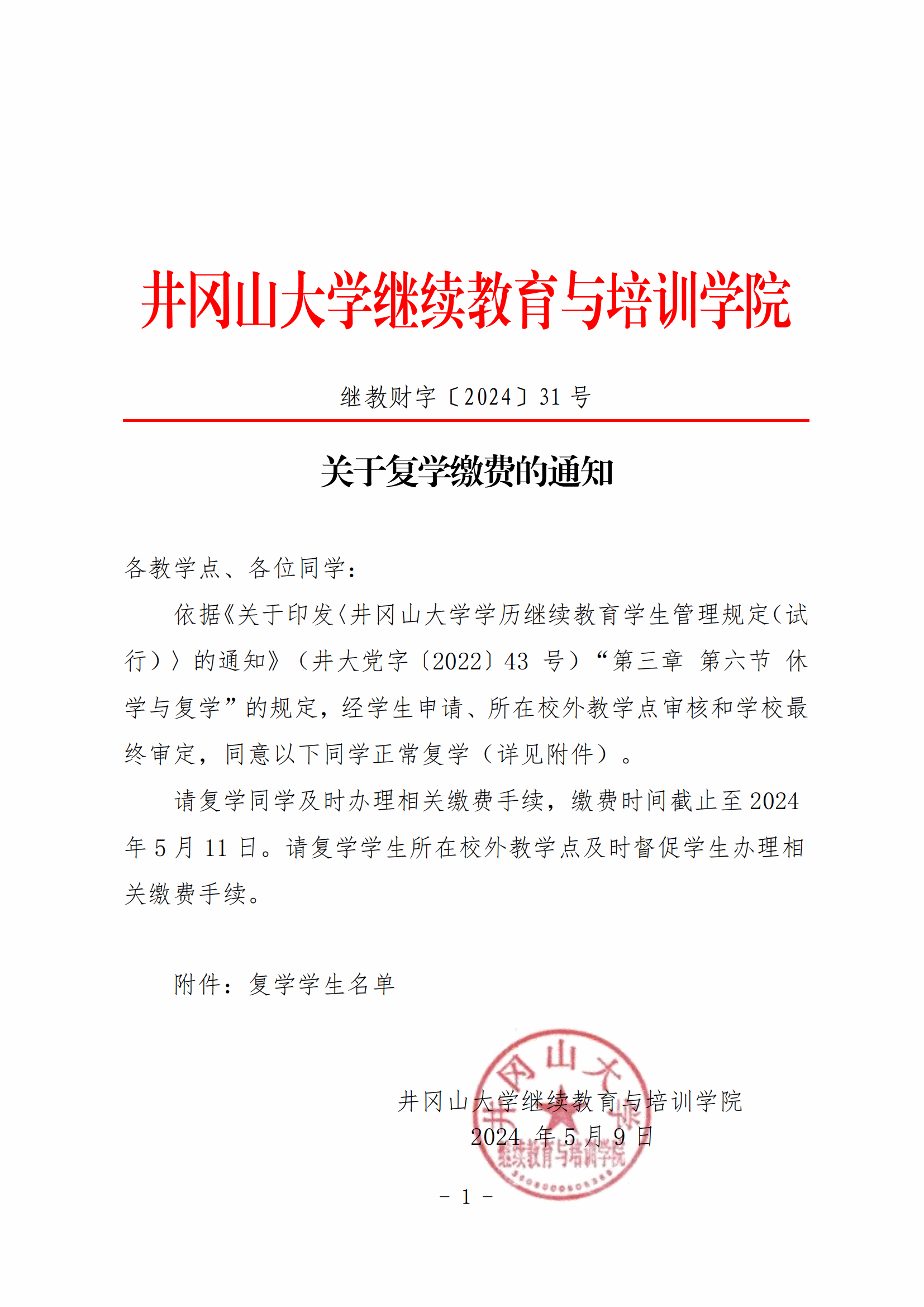 关于复学缴费的通知
