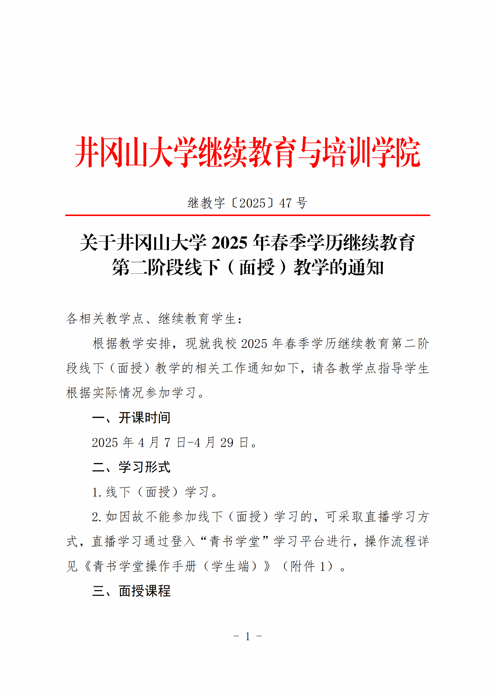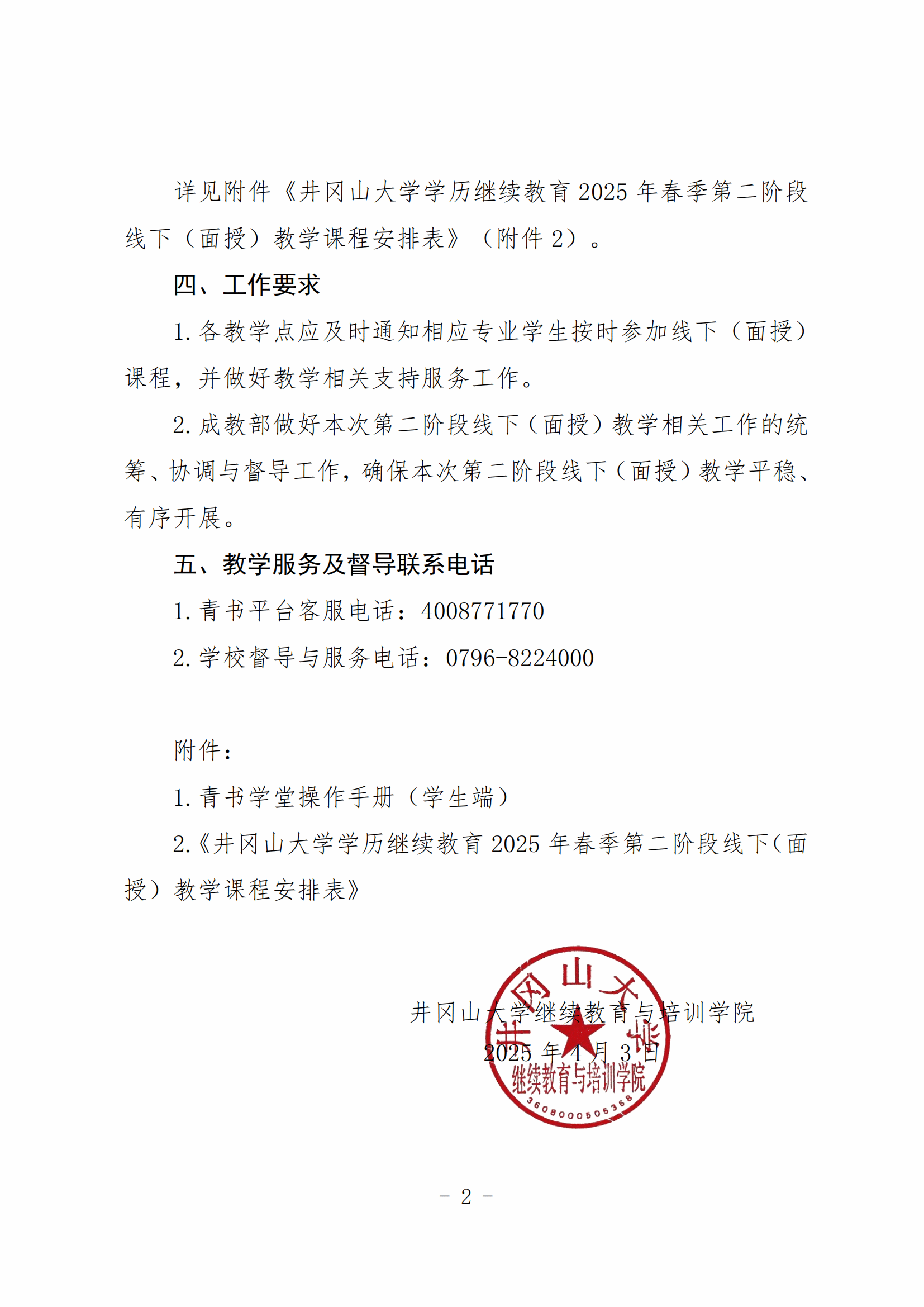 关于井冈山大学2025年春季学历继续教育第二阶段线下(面授)教学的通知