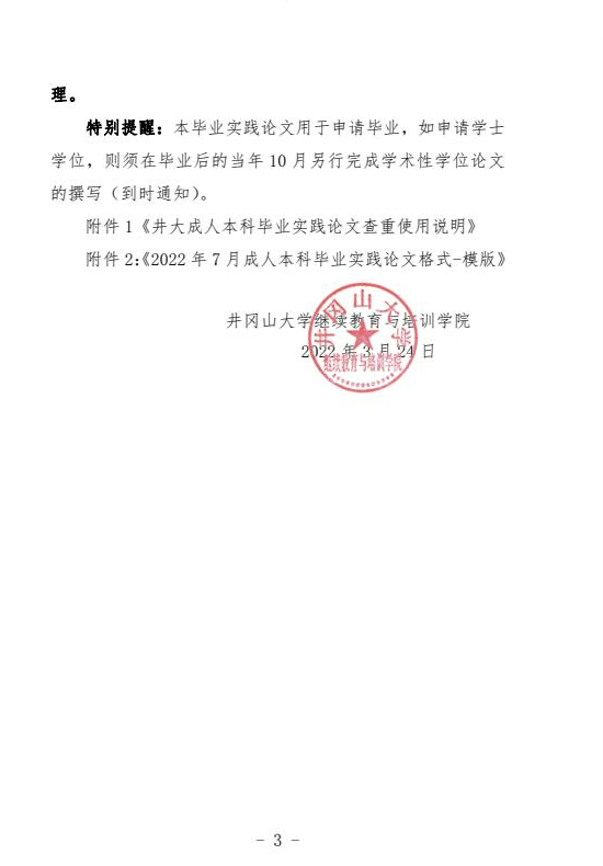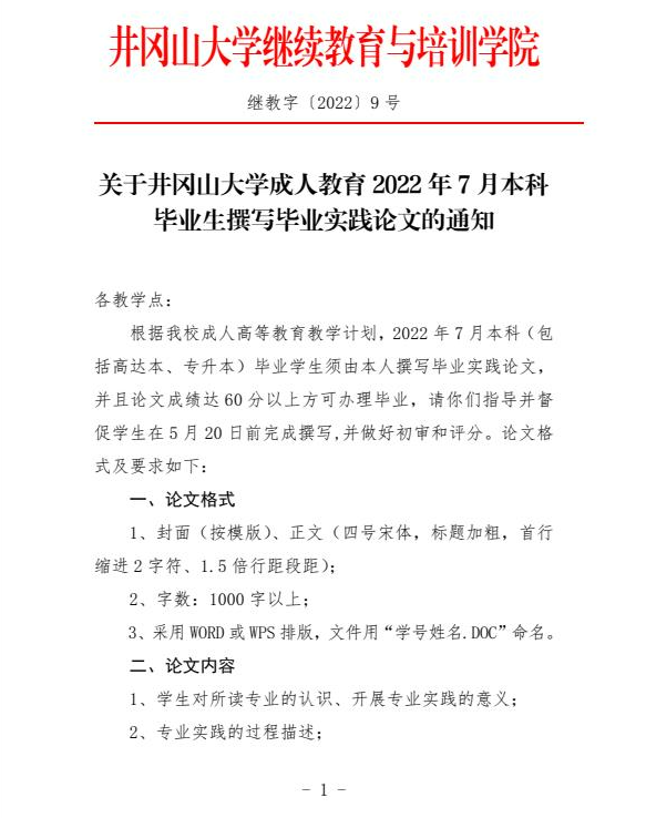 关于井冈山大学成人教育 2022 年 7 月本科毕业生撰写毕业实践论文的通知