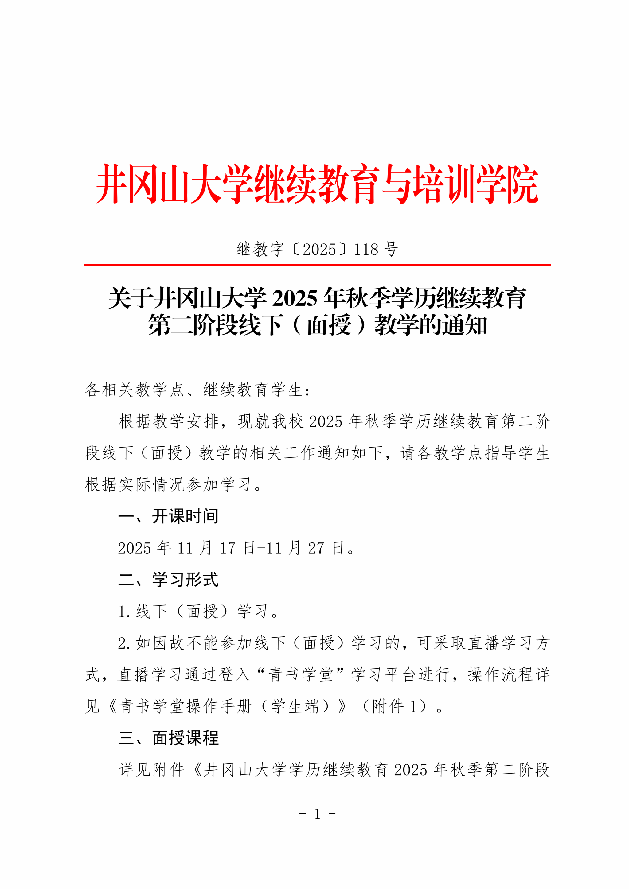 关于井冈山大学2025年秋季学历继续教育第二阶段线下(面授)教学的通知