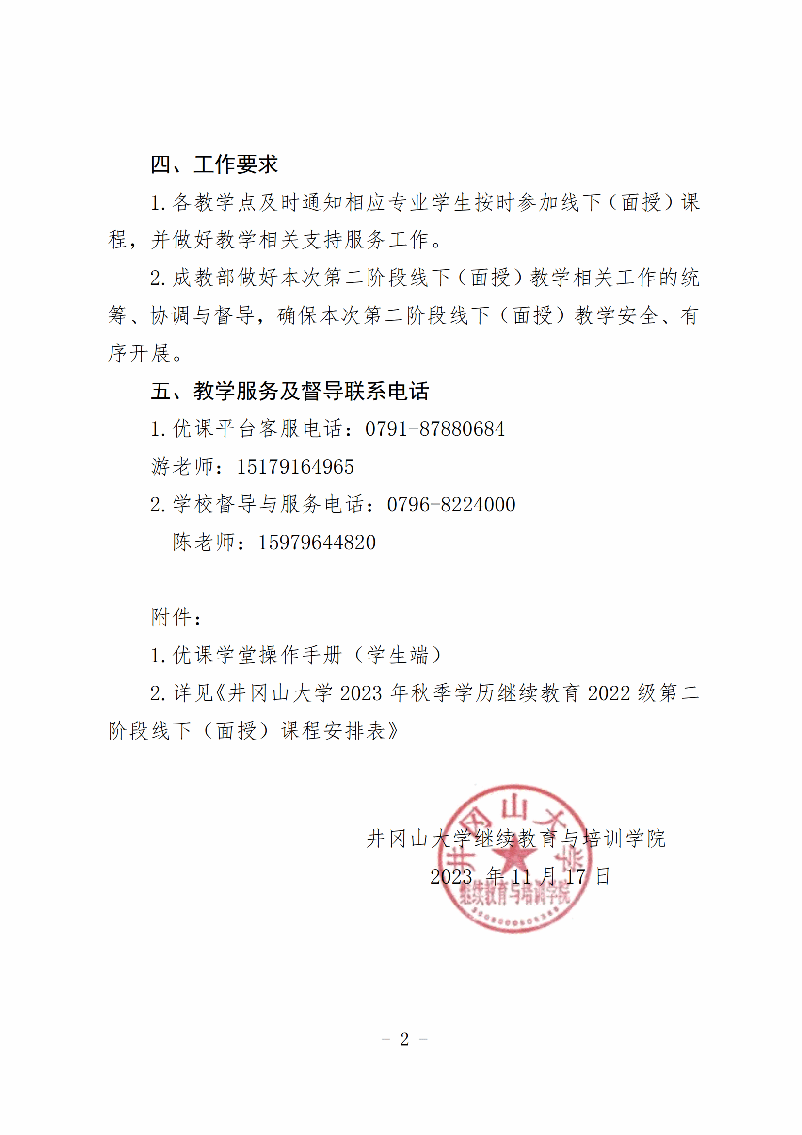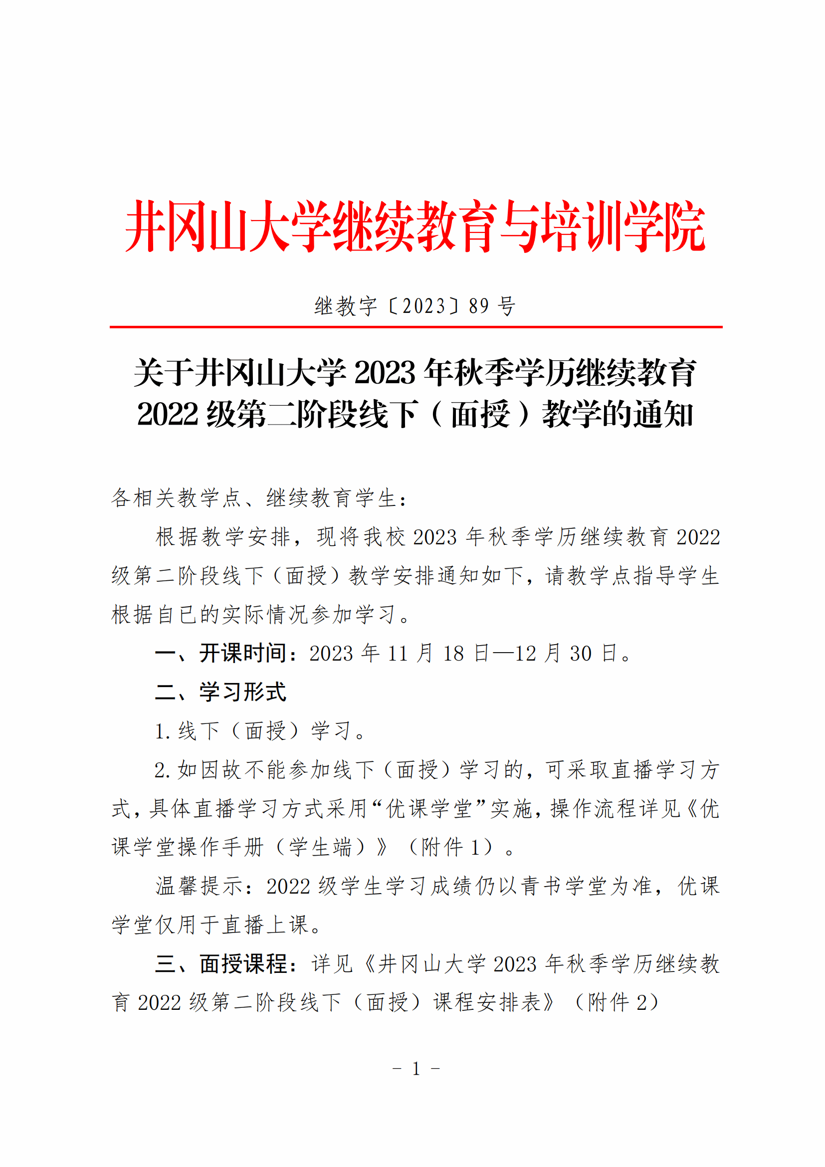 关于井冈山大学2023年秋季学历继续教育2022级第二阶段线下(面授)教学的通知