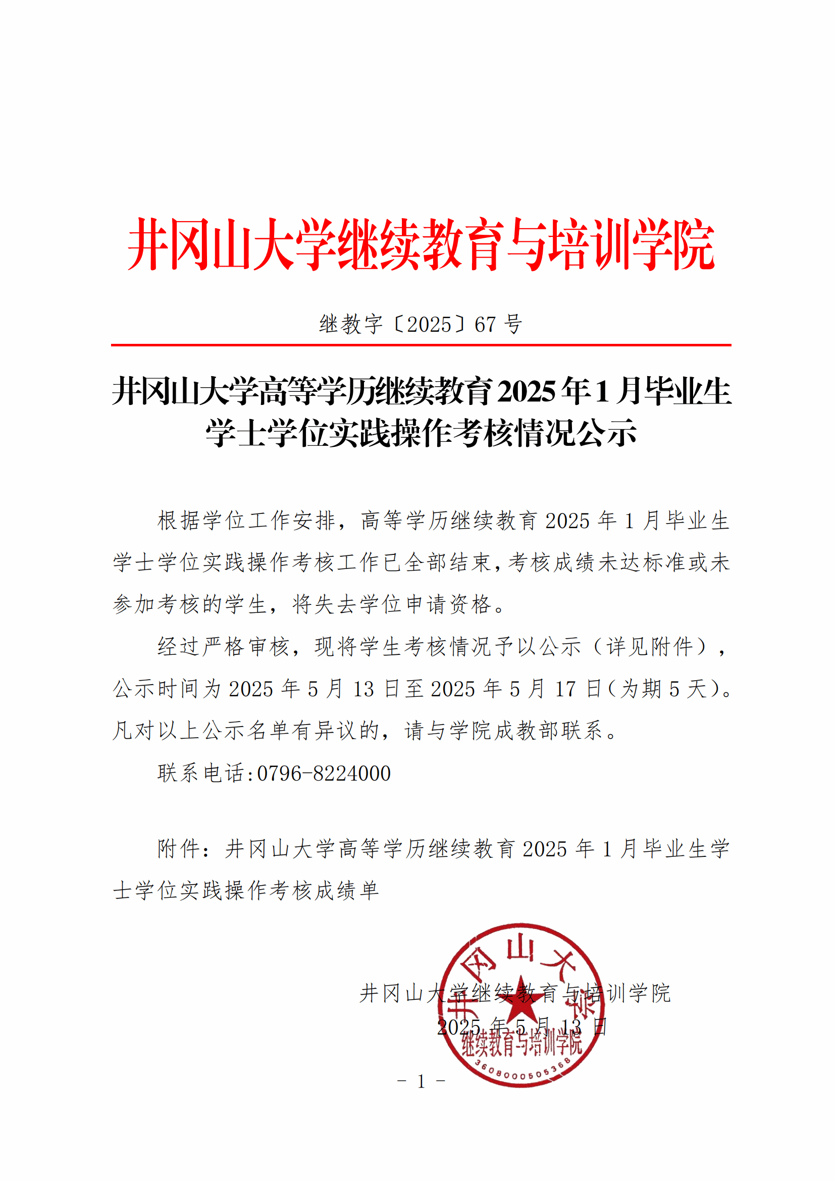 井冈山大学高等学历继续教育2025年1月毕业生学士学位实践操作考核情况公示