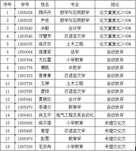 2021届成人学士学位论文未通过学生名单公示 发布时间:2022-06-29 根据学位工作安排,2021届成人学士学位论文撰写、指导和查重工作已全部结束,经《井冈山大学大学生毕业设计(论文)管理系统》汇总,仍有以下学生因自动放弃、未提交论文或论文重复比>30%等原因未能通过,现予以公示,如有异议,请于2021年5月17日17:00时前向我们反馈(电子邮箱:190400851@qq.com),逾期视为无异议。 特此公示。 井冈山大学继续教育与培训学院 2021年5月14日