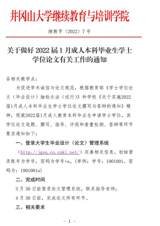 关于做好2022届1月成人本科毕业生学士学位论文有关工作的通知