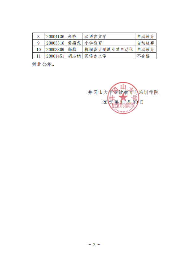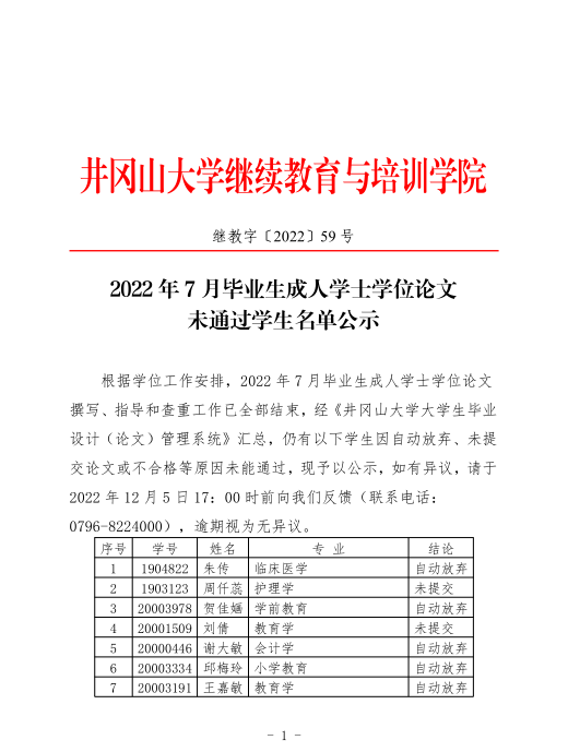 2022 年 7 月毕业生成人学士学位论文未通过学生名单公示