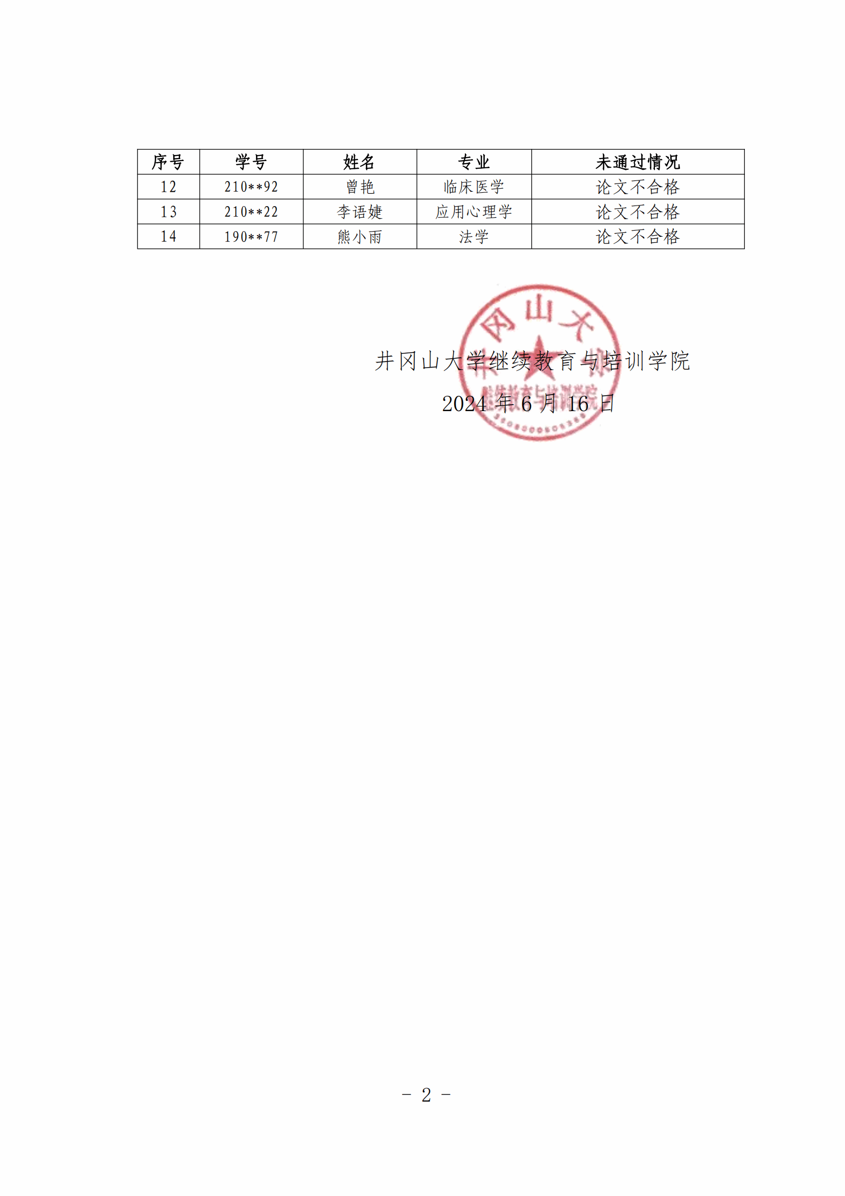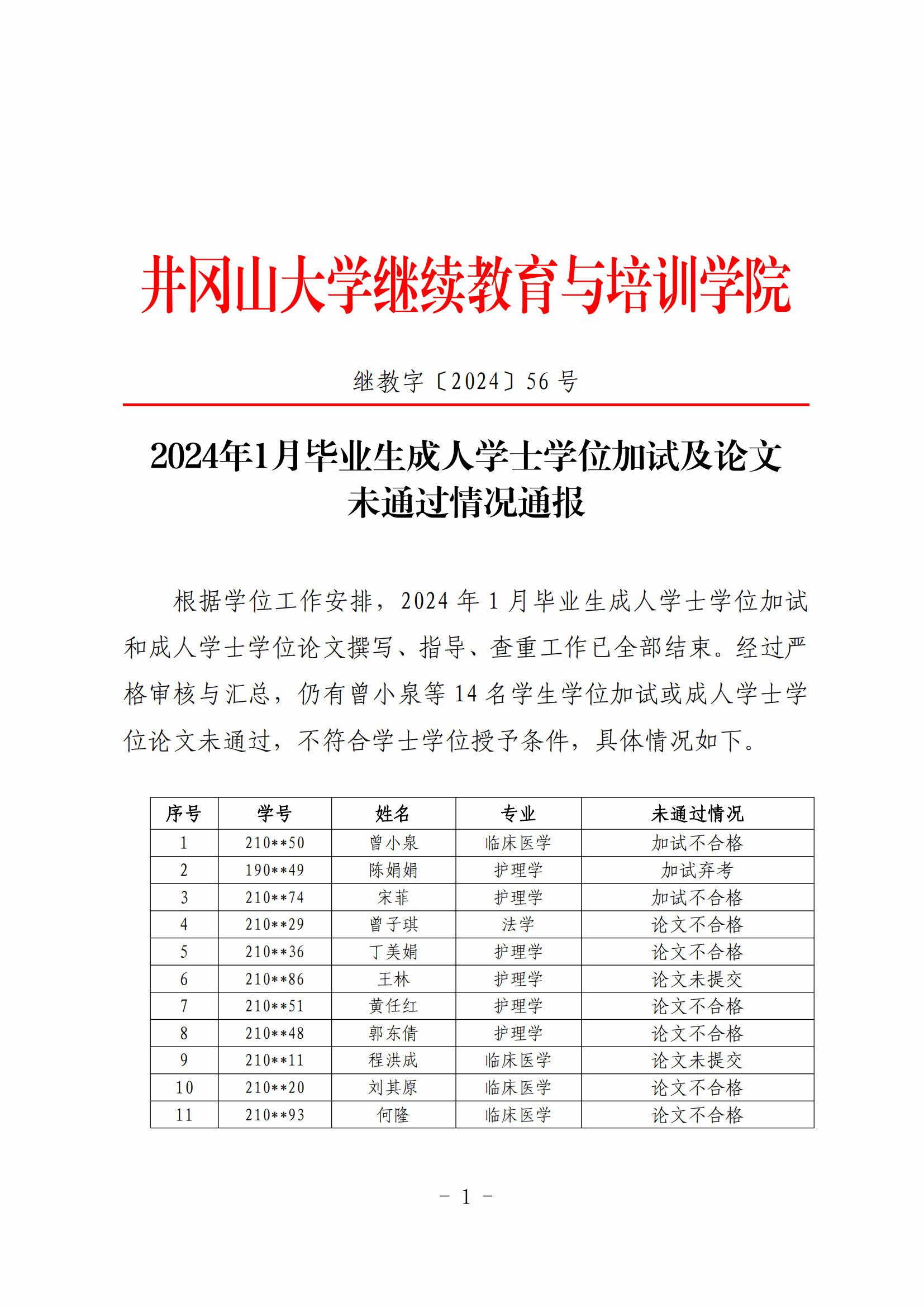 2024年1月毕业生成人学士学位加试及论文未通过情况通报