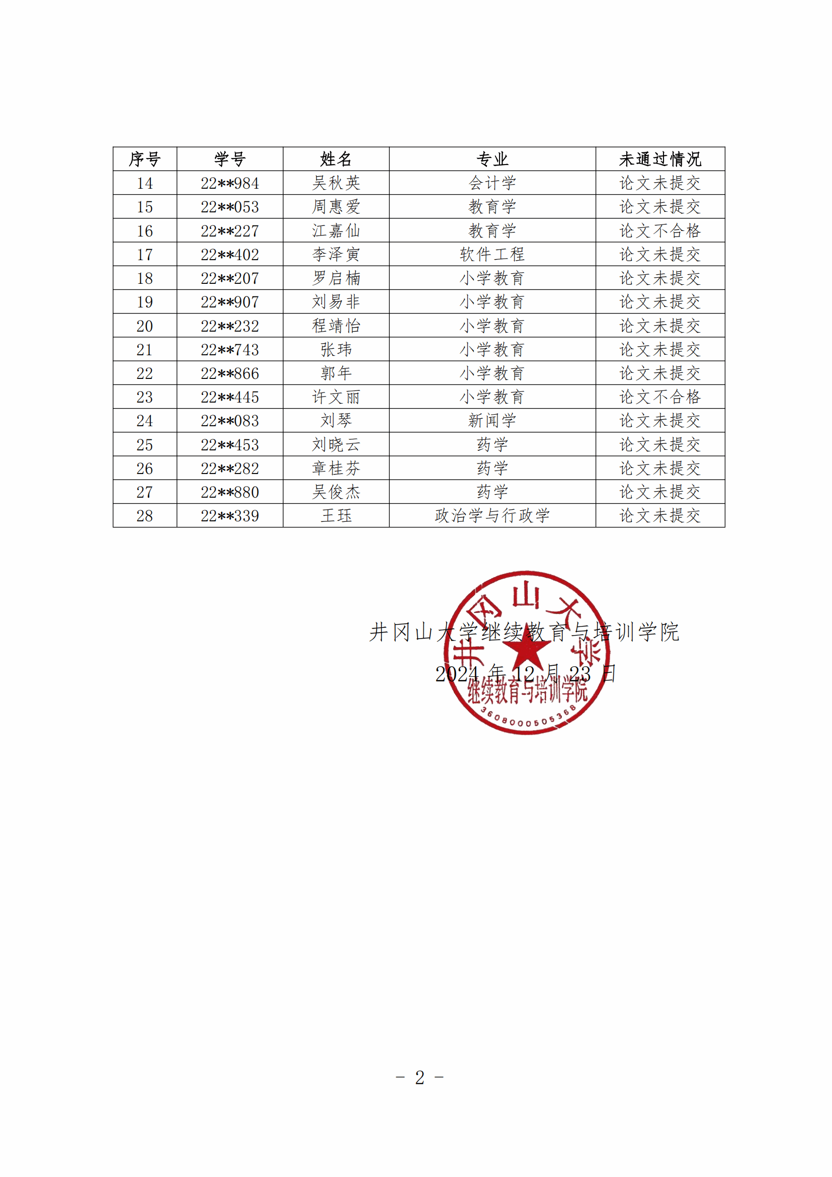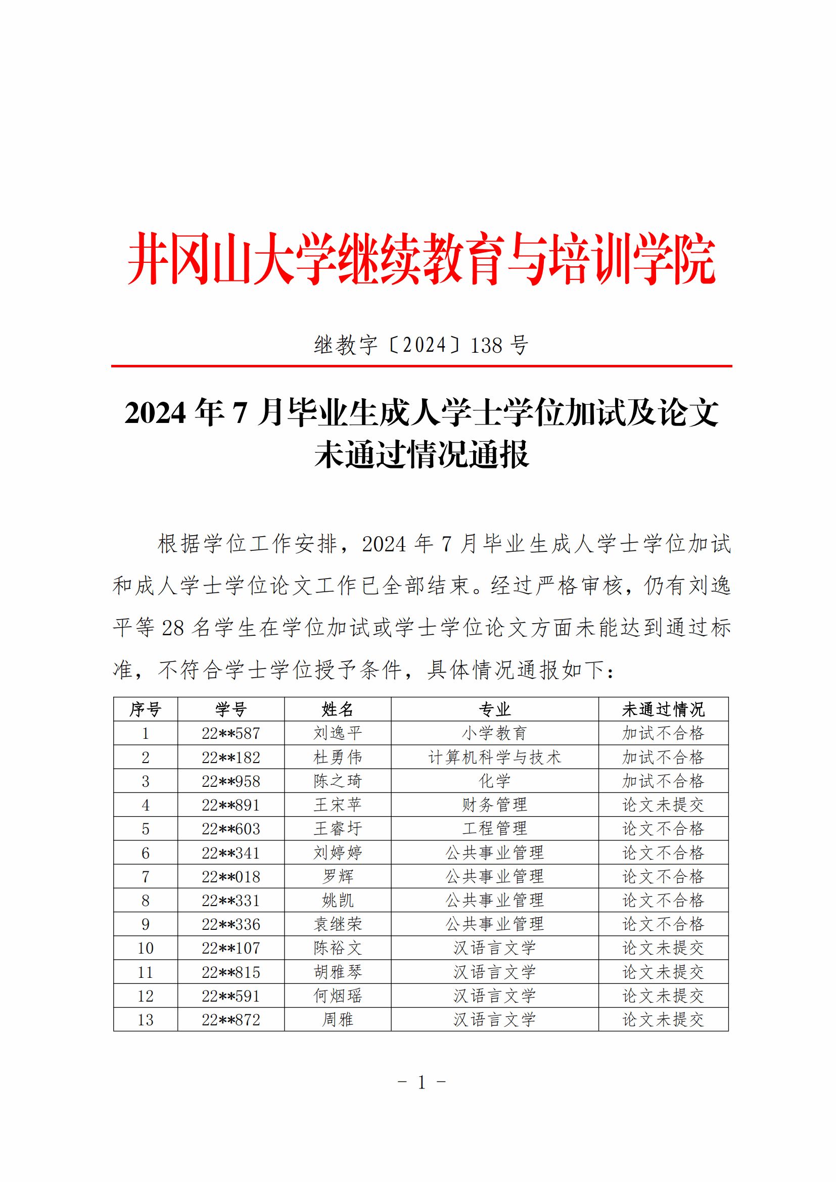 2024年7月毕业生成人学士学位加试及论文未通过情况通报