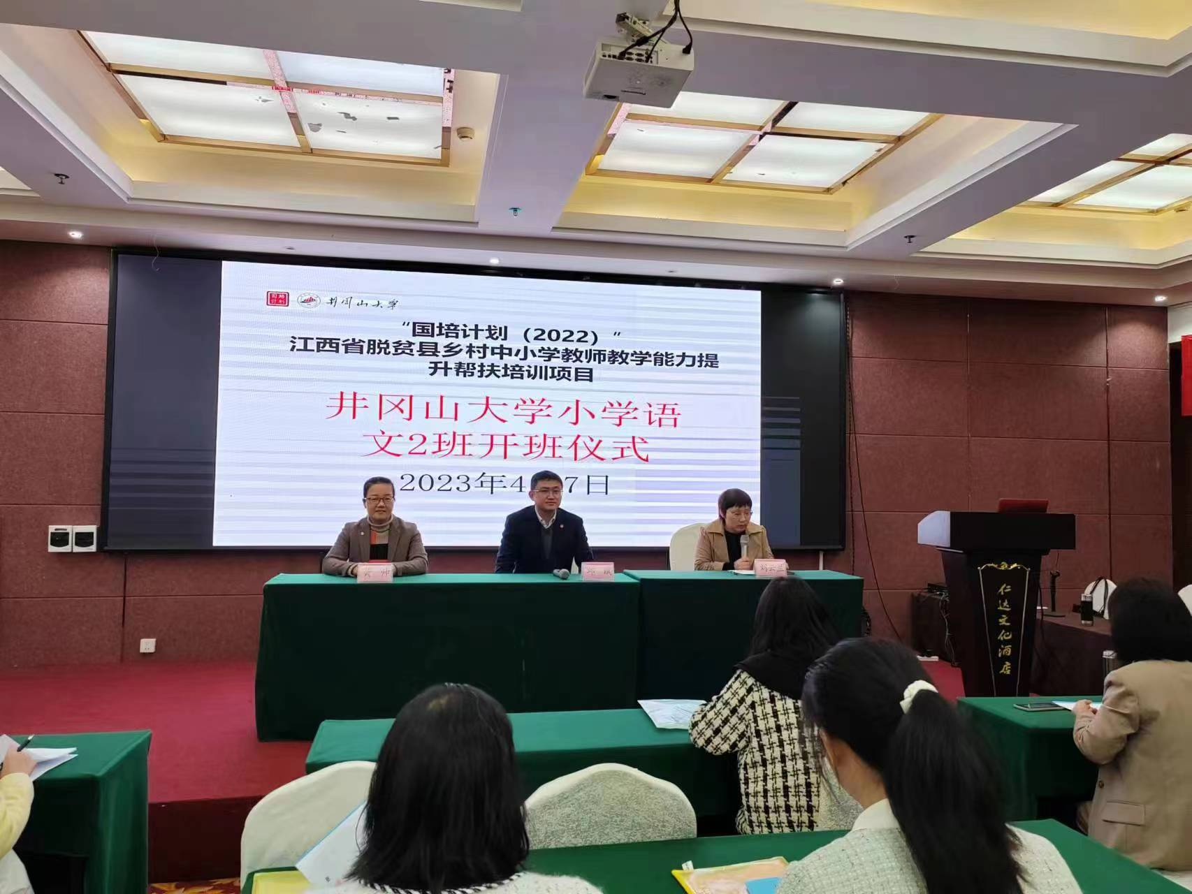 4月7日,“国培计划( 2022)”——江西省脱贫县乡村中小学教师教学能力提升帮扶培训(小学语文2班)开班仪式在仁达文化酒店五楼会议室举行。井冈山大学人文学院副院长邱斌出席开班式,人文学院刘云兰老师主持开班式。