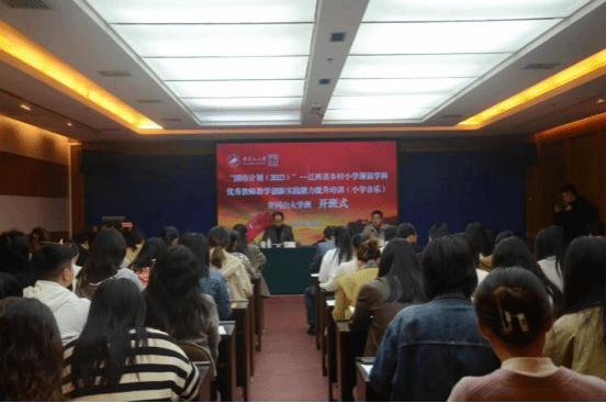 4月8日上午,“国培计划(2023)”—江西省乡村小学薄弱学科优秀教师教学创新实践能力提升培训(小学音乐)班在井冈山大学开班。井冈山大学艺术学院院长肖继仁作开班致辞,班主任欧阳绍清教授主持,本次参训的80名学员参加开班式。