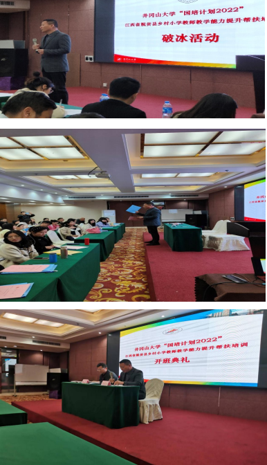 “国培计划(2022)”-江西省脱贫县乡村小学教师教学能力提升帮扶培训项目(小学数学1班)在我校开班 发布时间:2023-03-23 3月17日,“国培计划(2022)”-江西省脱贫县乡村小学教师教学能力提升帮扶培训项目(小学数学1班)在我校开班。 井冈山大学数理学院易华老师代表井冈山大学对参与国培的教师表示欢迎,并介绍了井冈山大学数理学院的办学情况。朱景文老师对这次国培项目的顺利开班表示祝贺,并介绍了这次国培计划培训班的培训时间、课程安排、培训要求等具体情况,李强征老师强调了培训纪律要求。 (文:易华,图:朱景文,审核:肖贻滨、王志民)